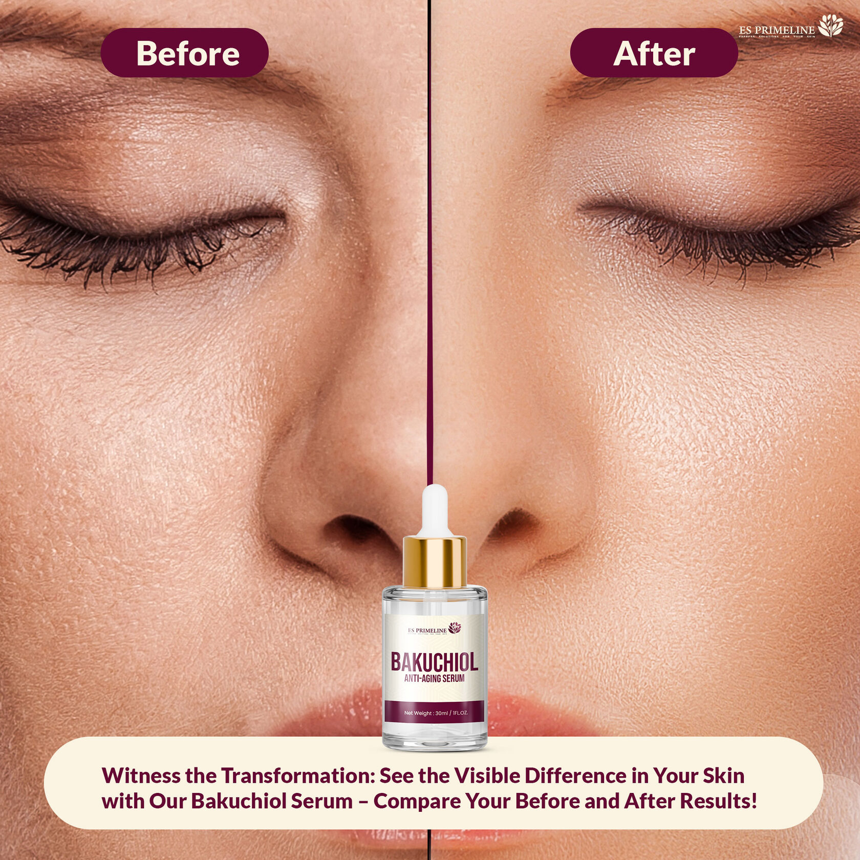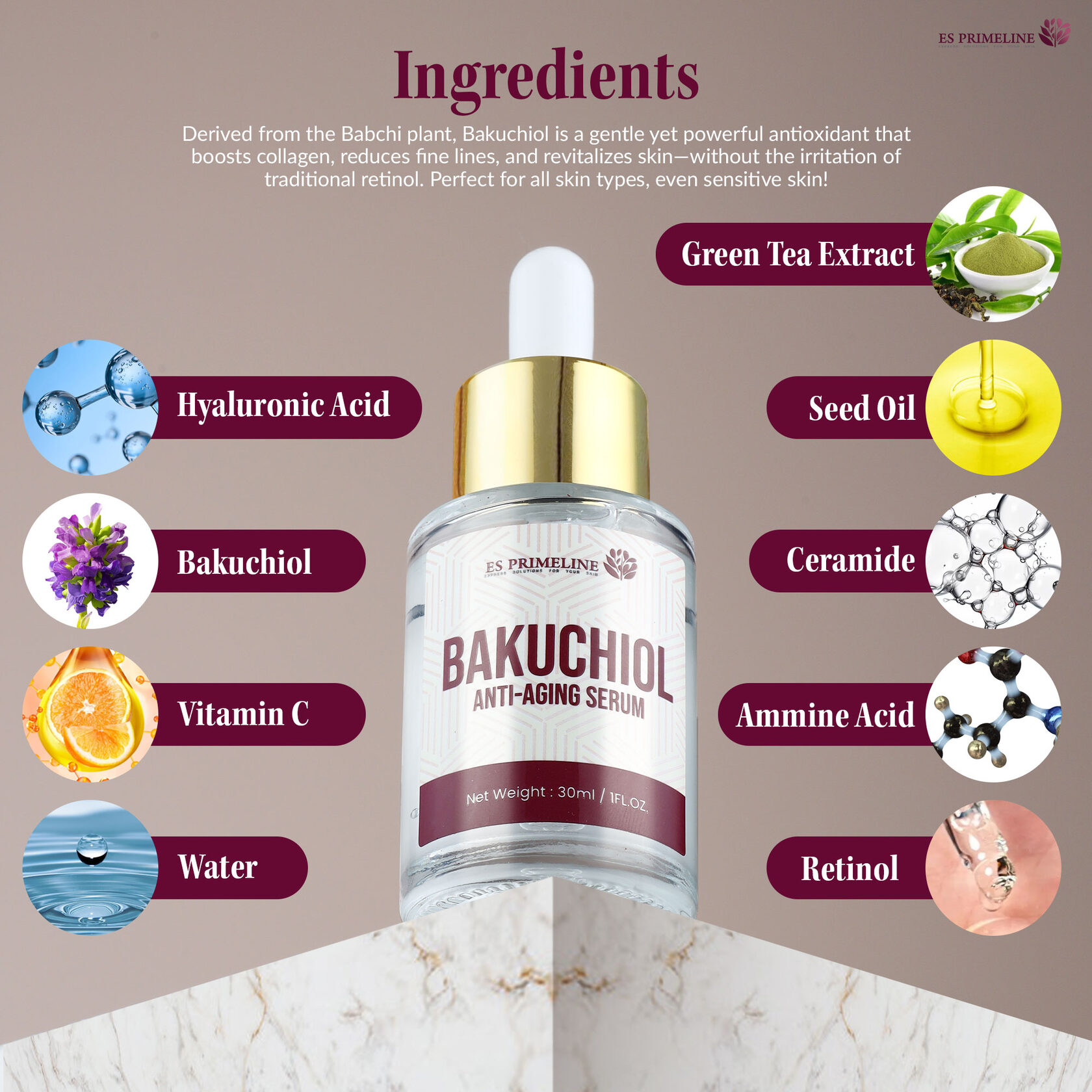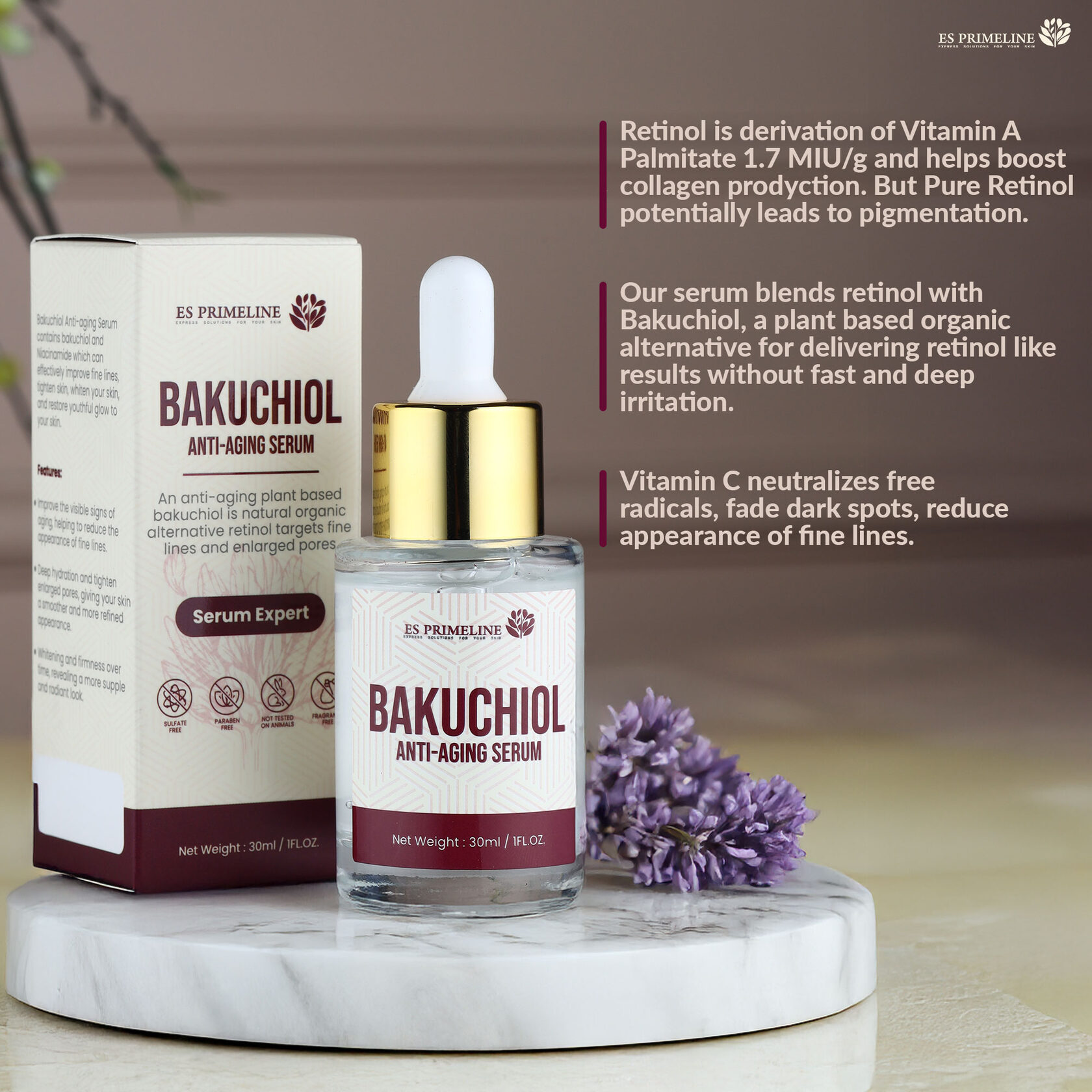 DESCRIPTIONULTIMATE SKINCARE POWERHOUSE – BAKUCHIOL + VITAMIN C + RETINOL COMPLEX Experience real results with our advanced 3-in-1 serum featuring Bakuchiol, Vitamin C, and Retinol—designed to smooth, brighten, and rejuvenate your skin. WHY RETINOL? A vitamin A derivative that boosts collagen, improves elasticity, and speeds up cell renewal for smoother, even-toned skin. Pure retinol can cause dryness or sensitivity, so our balanced formula helps minimize irritation. WHY BAKUCHIOL? A gentle, plant-based alternative to retinol. This antioxidant-rich extract supports collagen production, reduces wrinkles, and improves skin firmness—without the harsh side effects. WHY VITAMIN C? A hydrating, brightening antioxidant that protects skin from free radicals and helps even out tone while supporting moisture balance. 5 KEY BENEFITS OF ES PRIMELINE SERUM