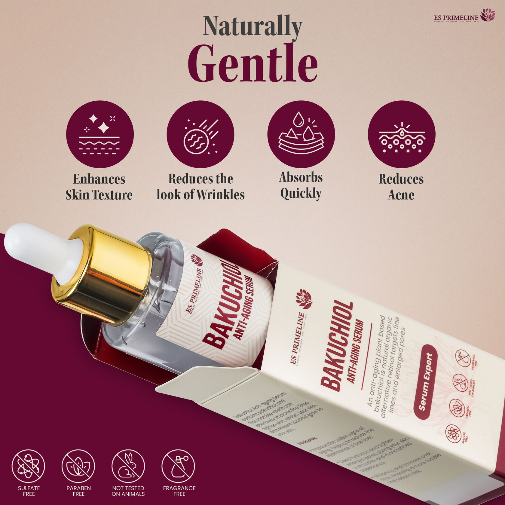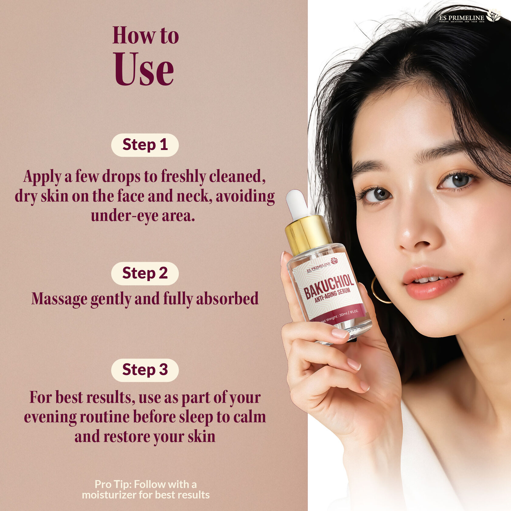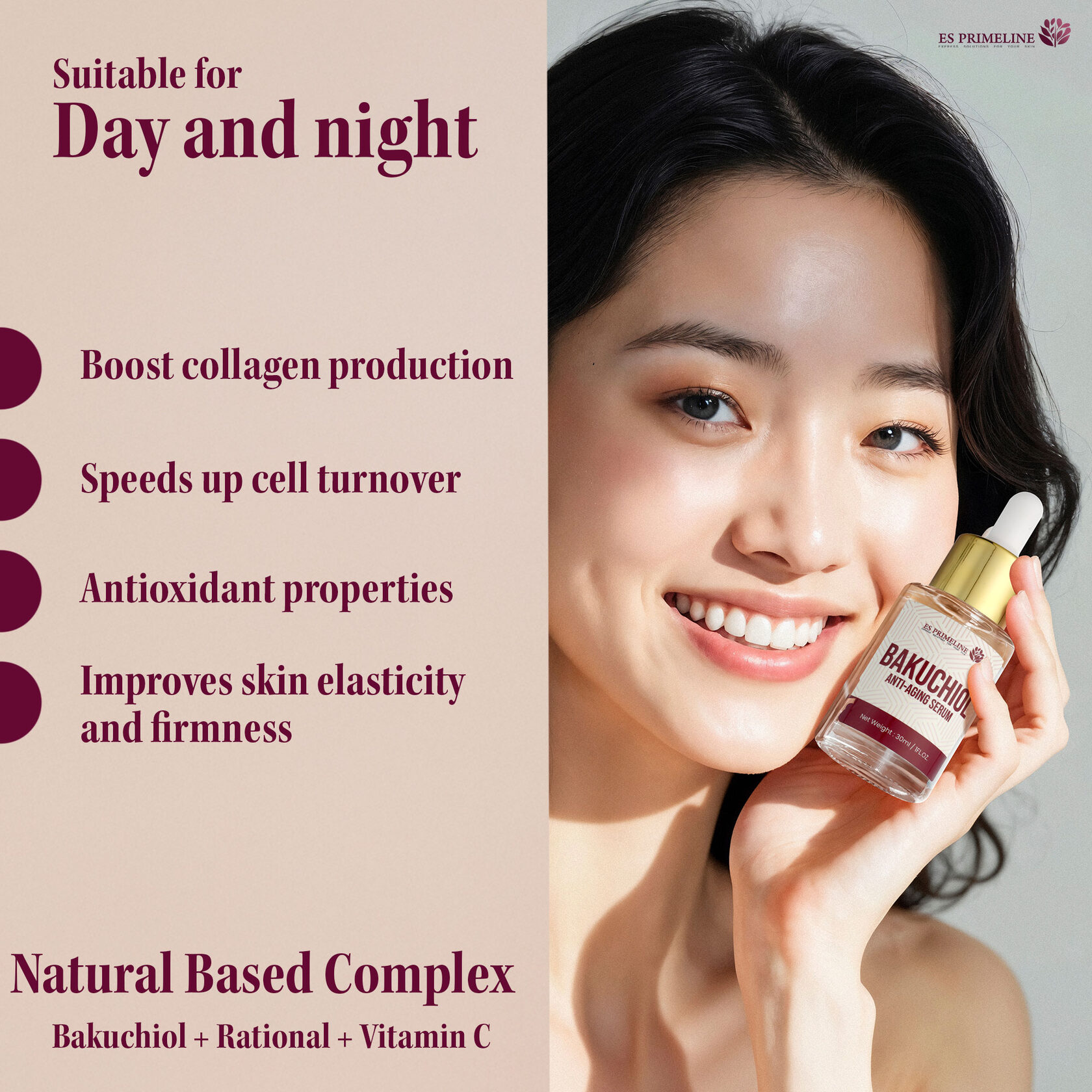 DESCRIPTIONULTIMATE SKINCARE POWERHOUSE – BAKUCHIOL + VITAMIN C + RETINOL COMPLEX Experience real results with our advanced 3-in-1 serum featuring Bakuchiol, Vitamin C, and Retinol—designed to smooth, brighten, and rejuvenate your skin. WHY RETINOL? A vitamin A derivative that boosts collagen, improves elasticity, and speeds up cell renewal for smoother, even-toned skin. Pure retinol can cause dryness or sensitivity, so our balanced formula helps minimize irritation. WHY BAKUCHIOL? A gentle, plant-based alternative to retinol. This antioxidant-rich extract supports collagen production, reduces wrinkles, and improves skin firmness—without the harsh side effects. WHY VITAMIN C? A hydrating, brightening antioxidant that protects skin from free radicals and helps even out tone while supporting moisture balance. 5 KEY BENEFITS OF ES PRIMELINE SERUM