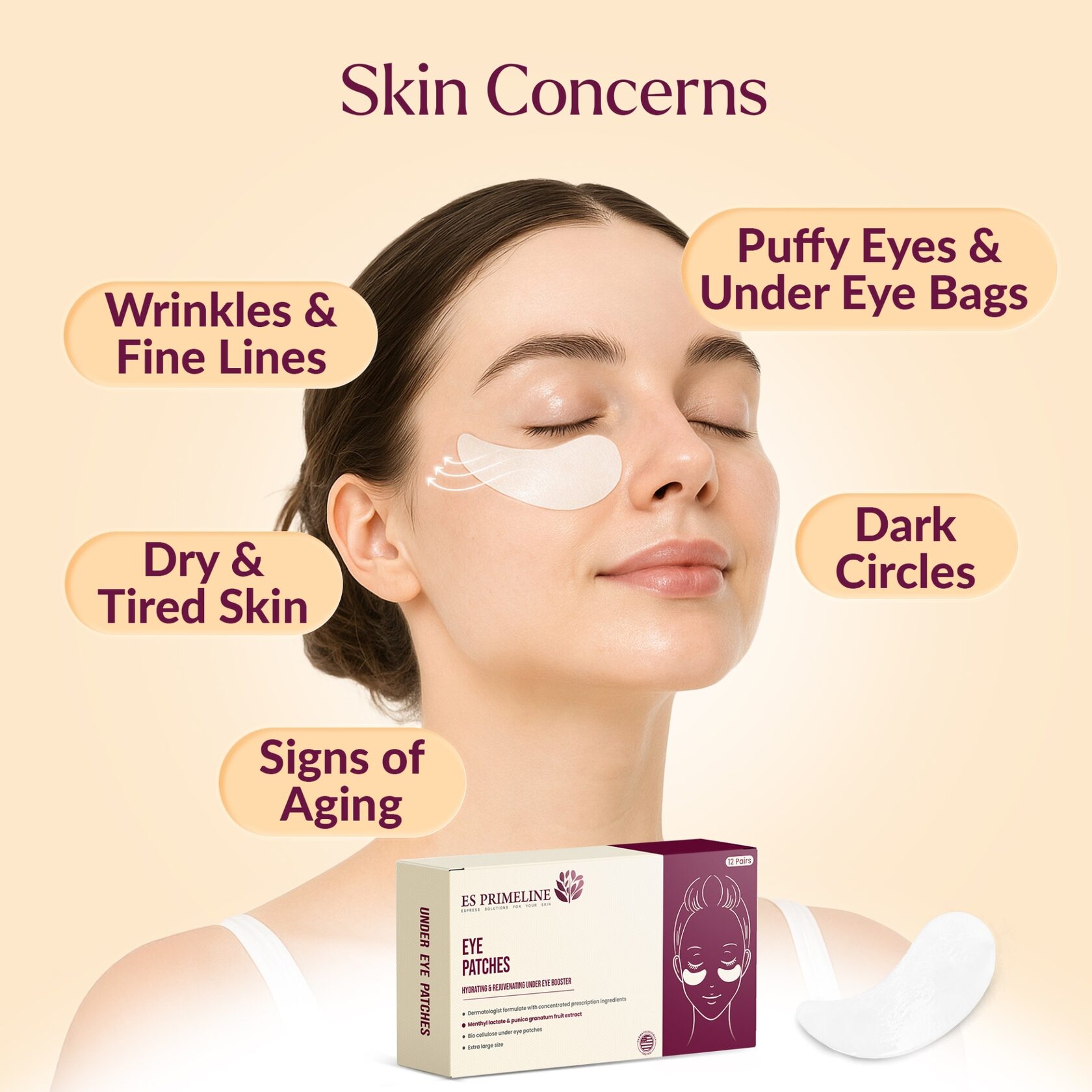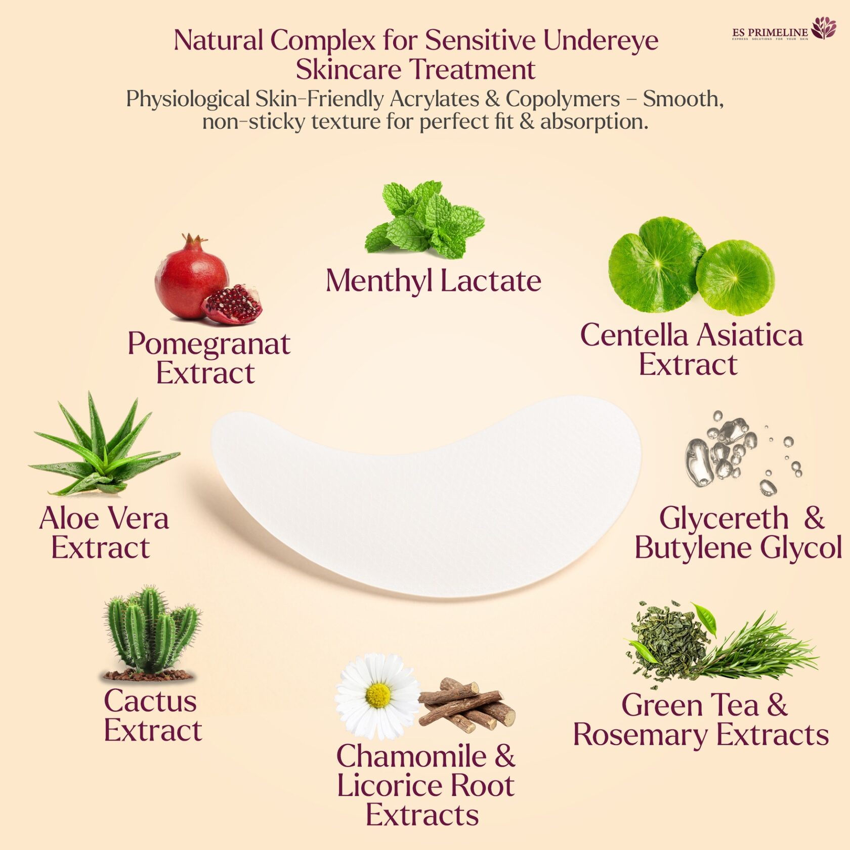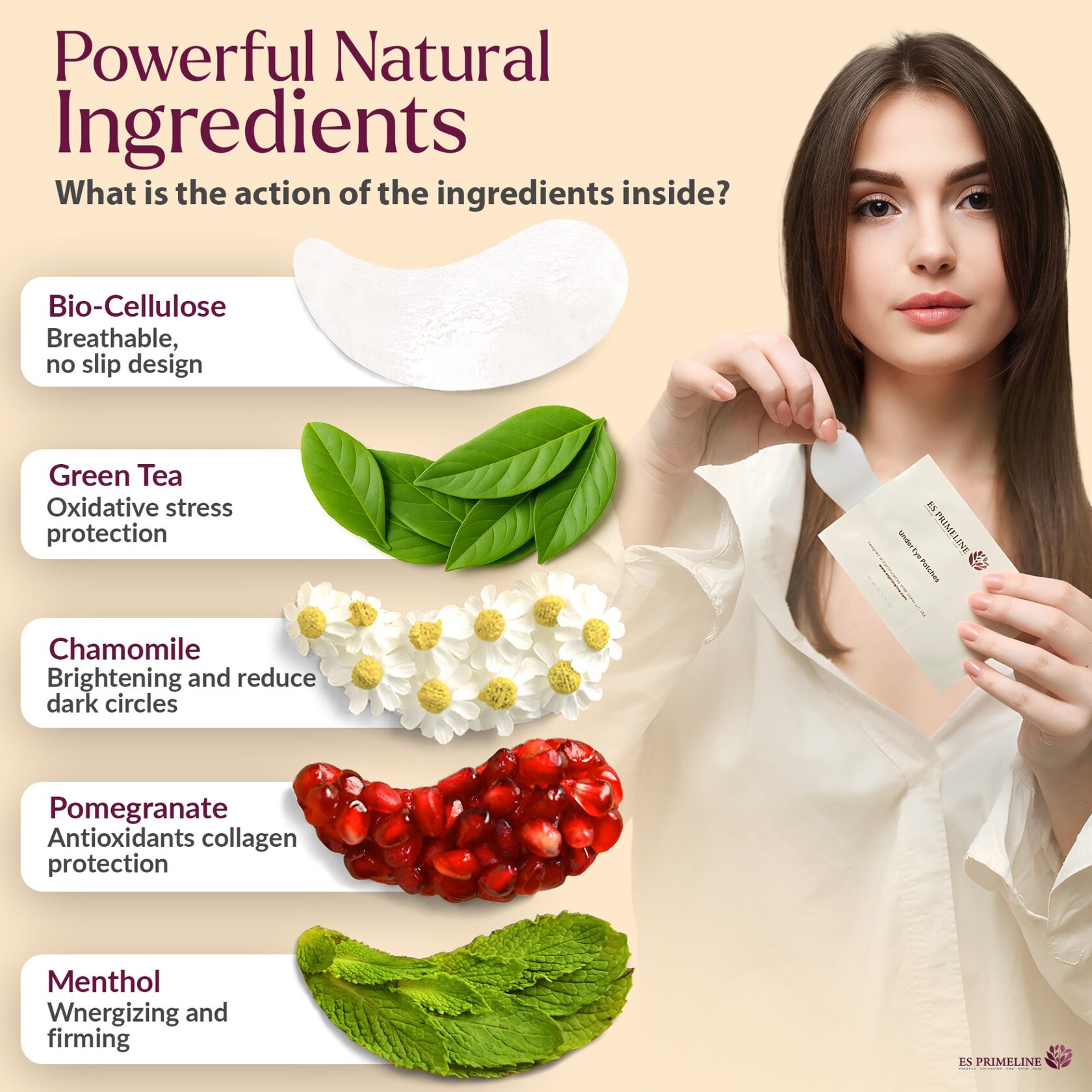 DESCRIPTION EXCLUSIVE FORMULA – Where Nature Meets Science ES PrimeLine’s advanced blend of Pomegranate, Chamomile, Menthyl Lactate, Centella Asiatica, Rosemary, and Aloe delivers brighter, smoother, refreshed skin. Helps reduce puffiness and dark circles while supporting collagen renewal for a hydrated, revitalized look from the first use. BIO-CELLULOSE COMFORT Made with premium Bio Cellulose, our breathable patches deliver ingredients deep into the skin without irritation or dryness. Unlike hydrogel patches that block airflow and pull moisture out, Bio Cellulose nourishes continuously and supports natural hydration. POWERFUL BENEFITS